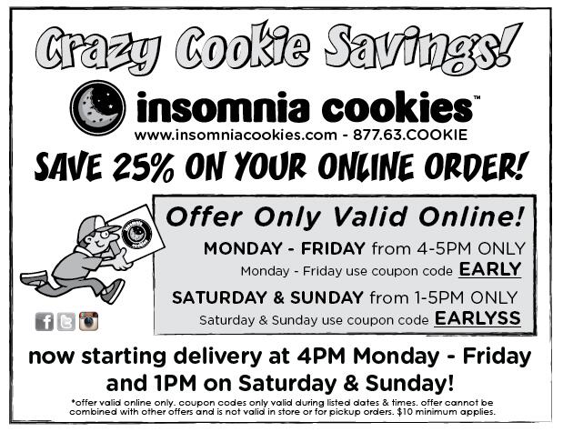 Insomnia Cookies On Twitter Take 25 Off Online Orders From 4 5pm Monday Friday Use Coupon Code Early At Checkout Http T Co E2gispeoc8 Http T Co Fiwzfhngov