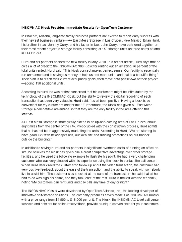 Insomniac Kiosk Provides Immediate Results For Opentech Customer