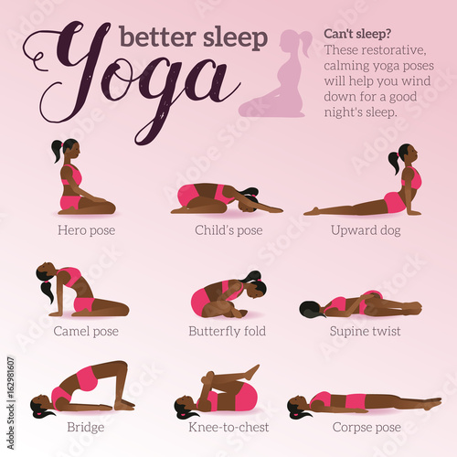 Yoga Poses For Better Sleep Vector Illustrations With Woman In Sport Bra And Shorts Doing Asanas From Insomnia And Relaxing Healthy Poster In Flat Vector Design On Rose Gradient Background Buy